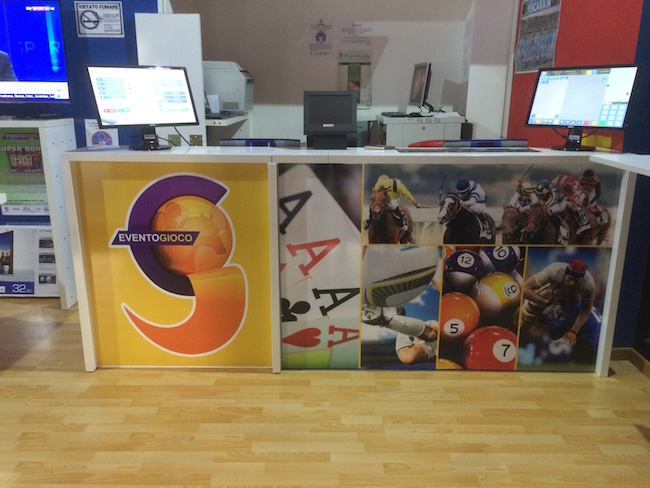- Allestimento bancone con pannello in forex e grafiche adesive a colori
