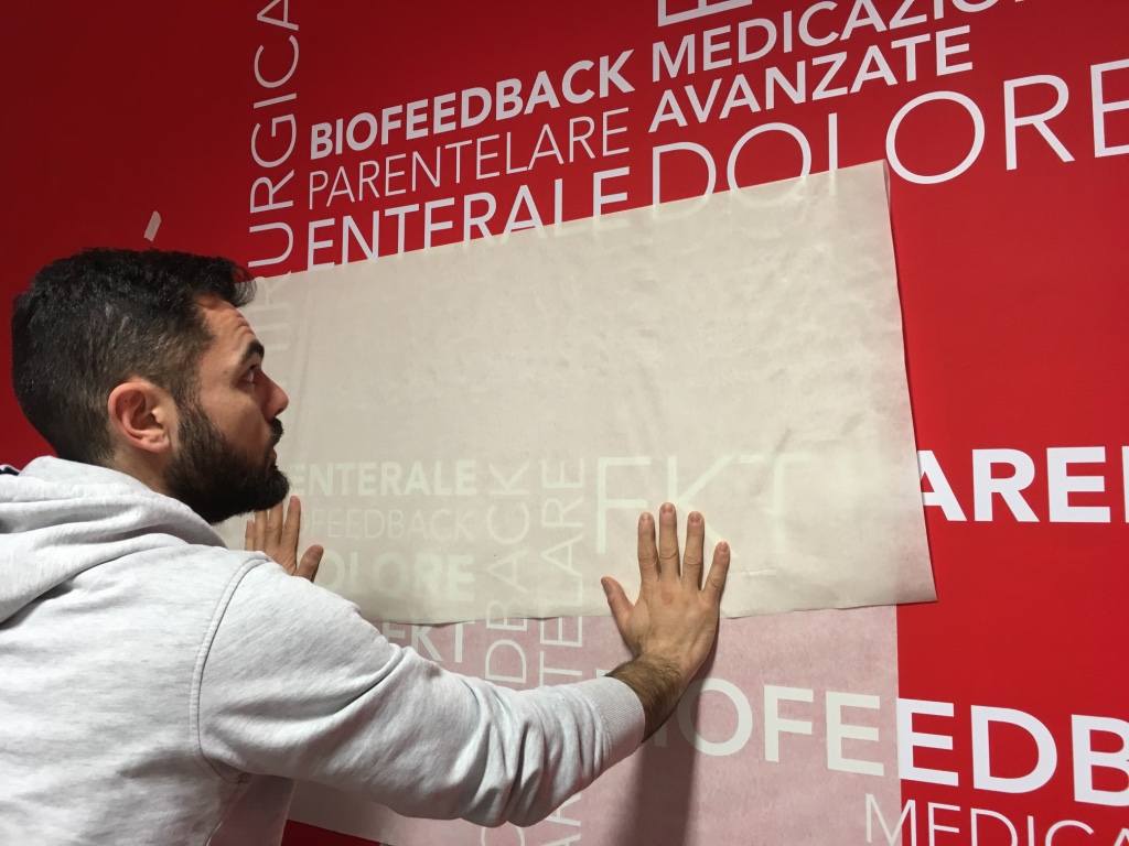 Wordcloud su parete Realizzazione wordcloud con adesivo intagliato prespaziato opaco e applicazione su parete